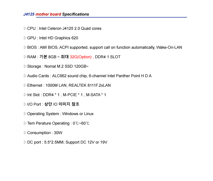 - 메모리 : DDR4 ram 1 slot , 기본 8G (최대 32G 까지 업그레이드 가능)